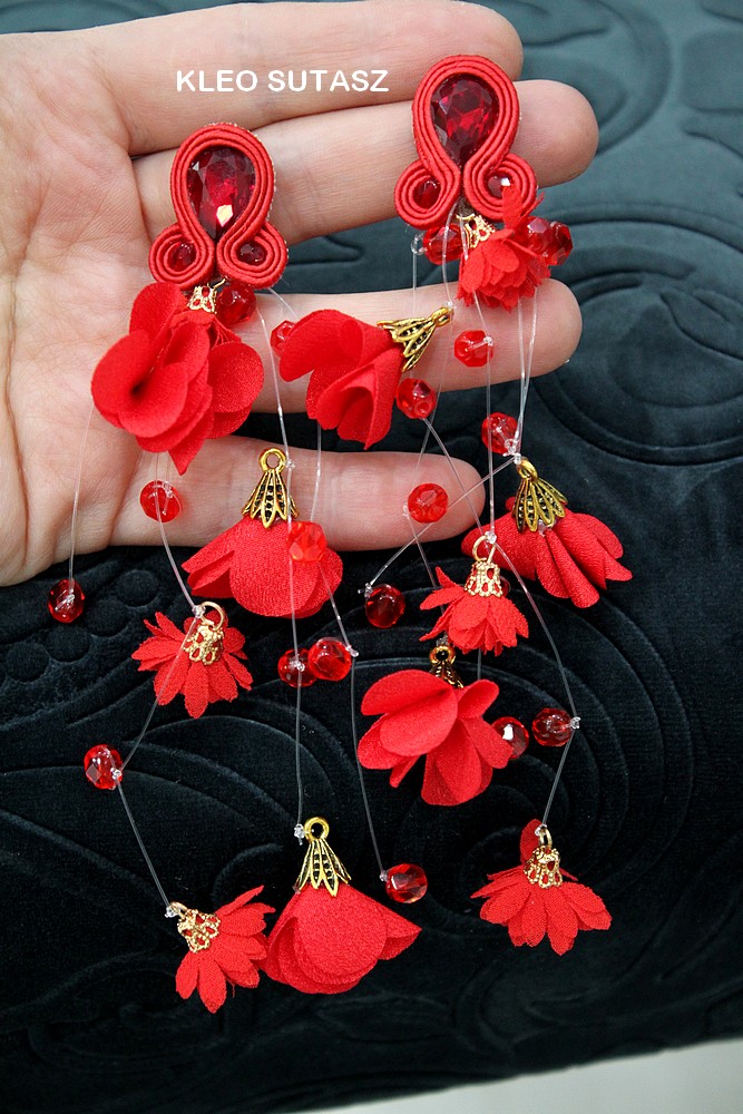 FLORE- CZERWONE, ZŁOTE, DŁUGIE, KOLCZYKI, SUTASZ, KWIATY, KWIATKI