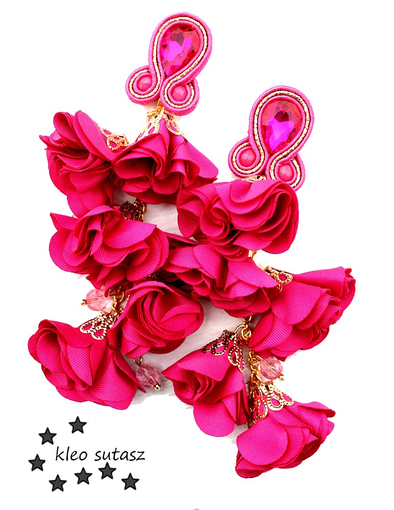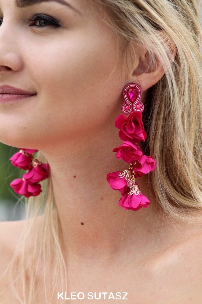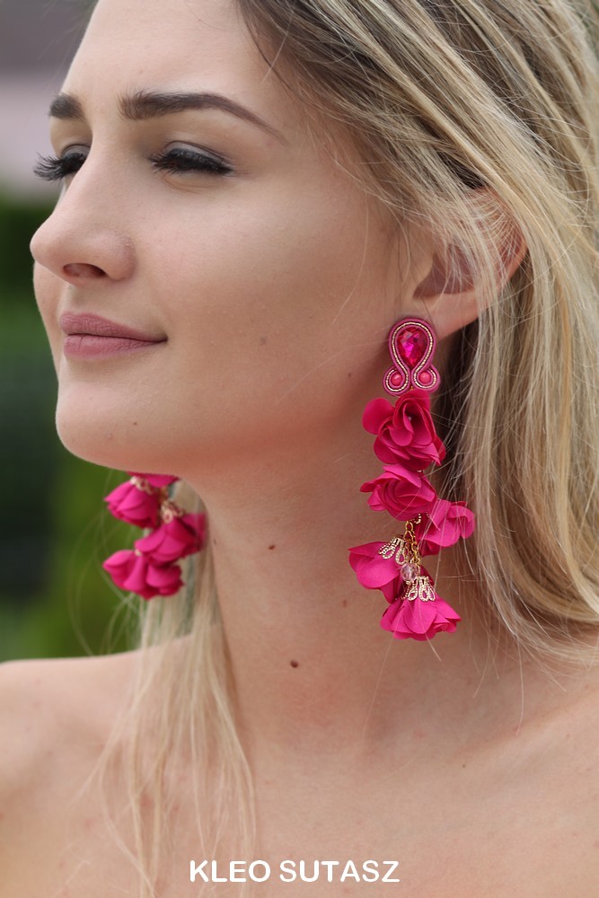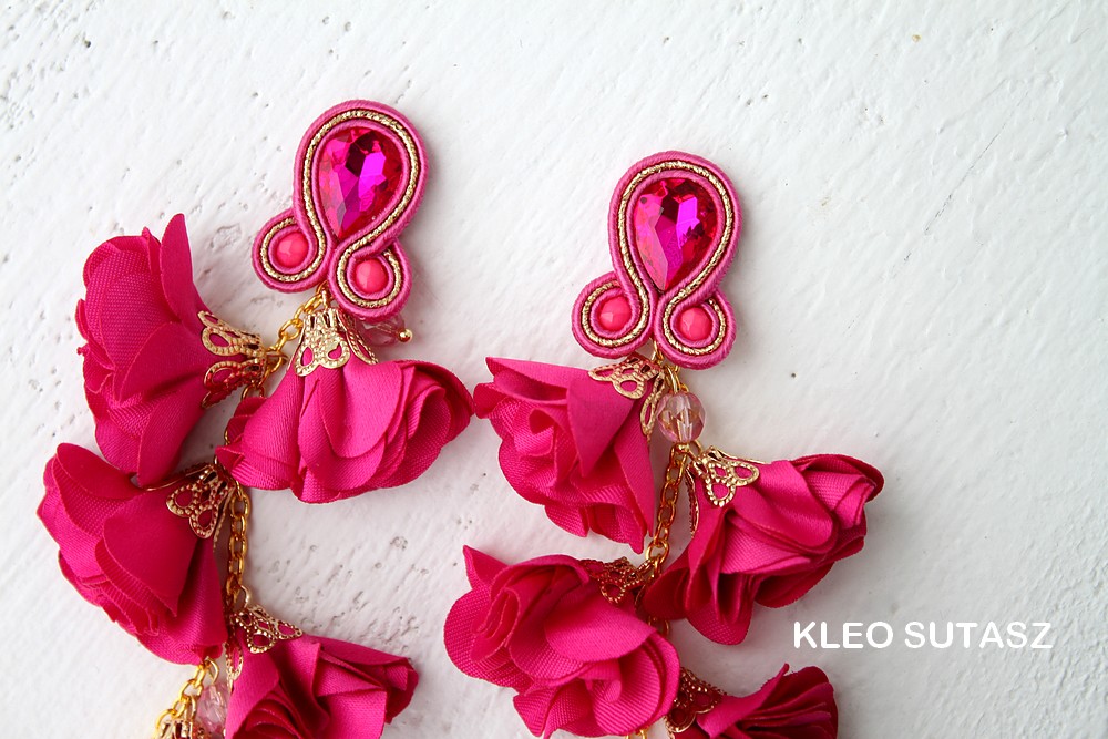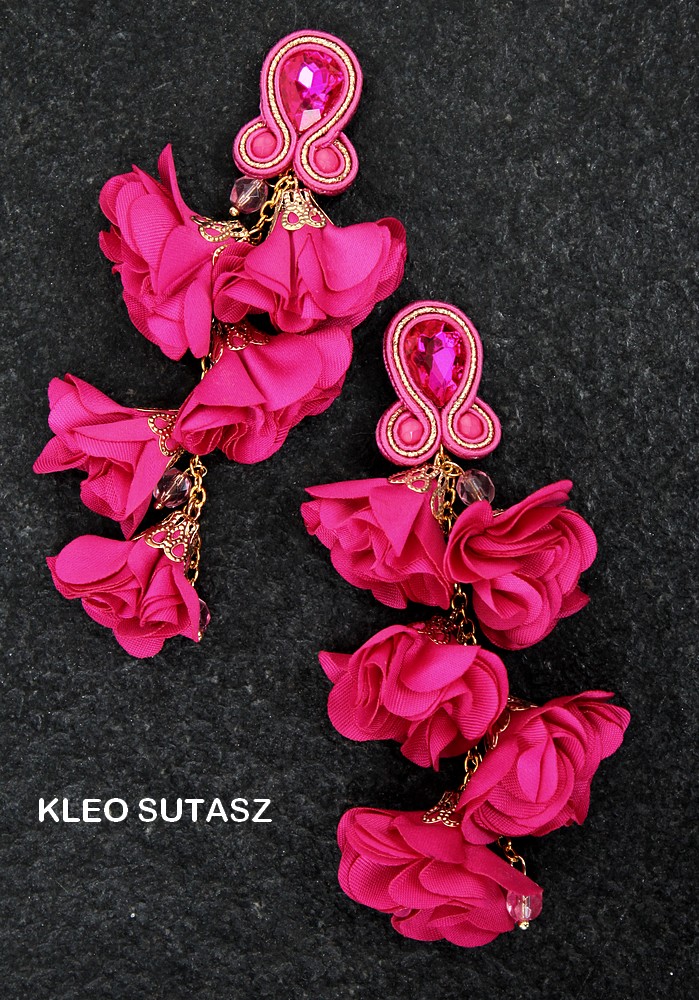 FLORE FUKSJA- FUKSJOWE, RÓŻOWE, DŁUGIE KOLCZYKI SUTASZ Z KWIATKAMI ZŁOTE