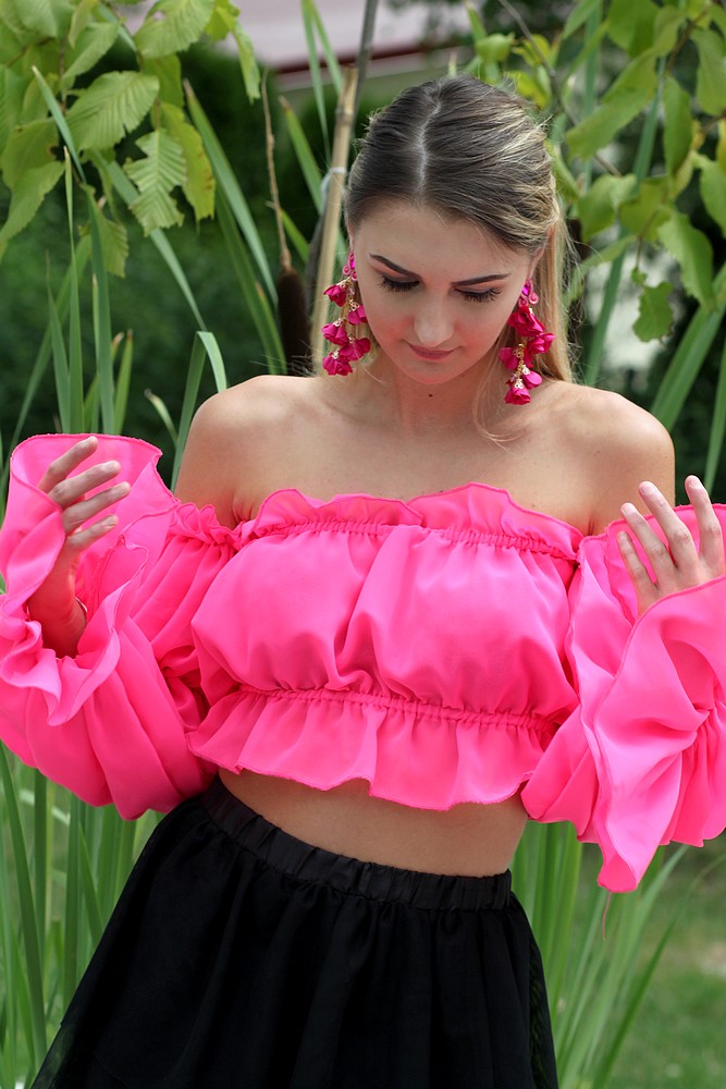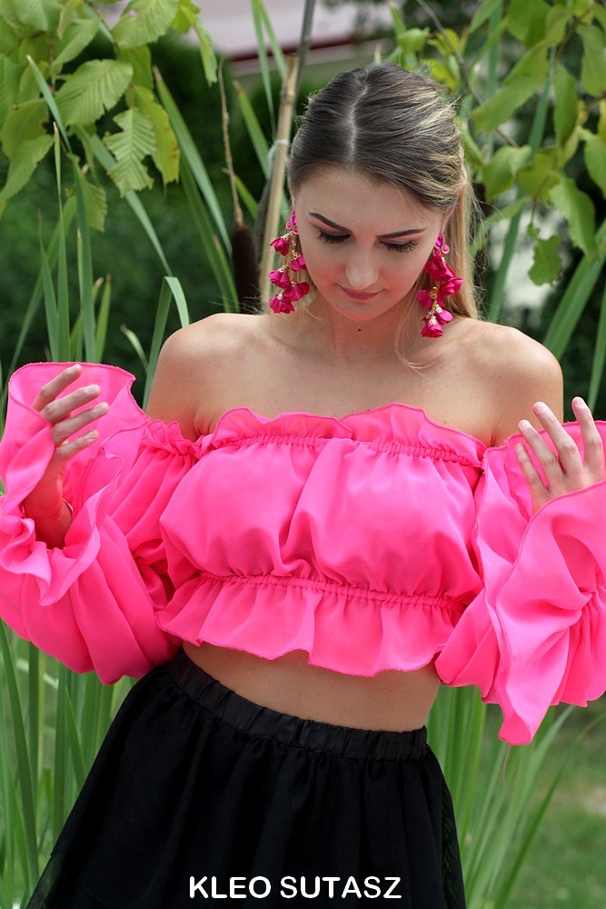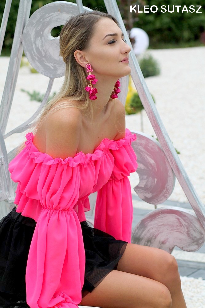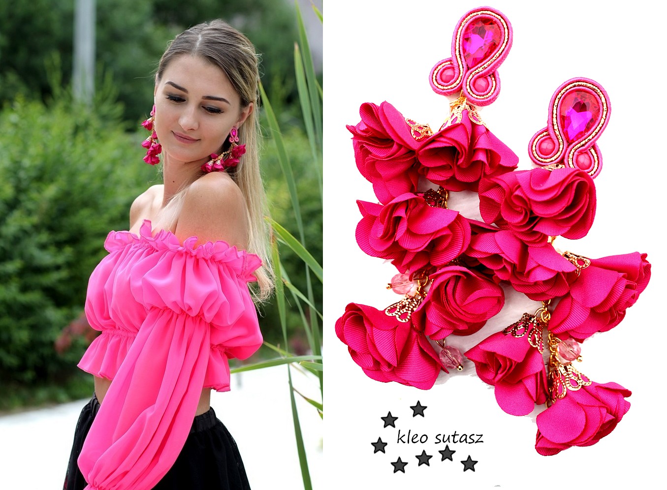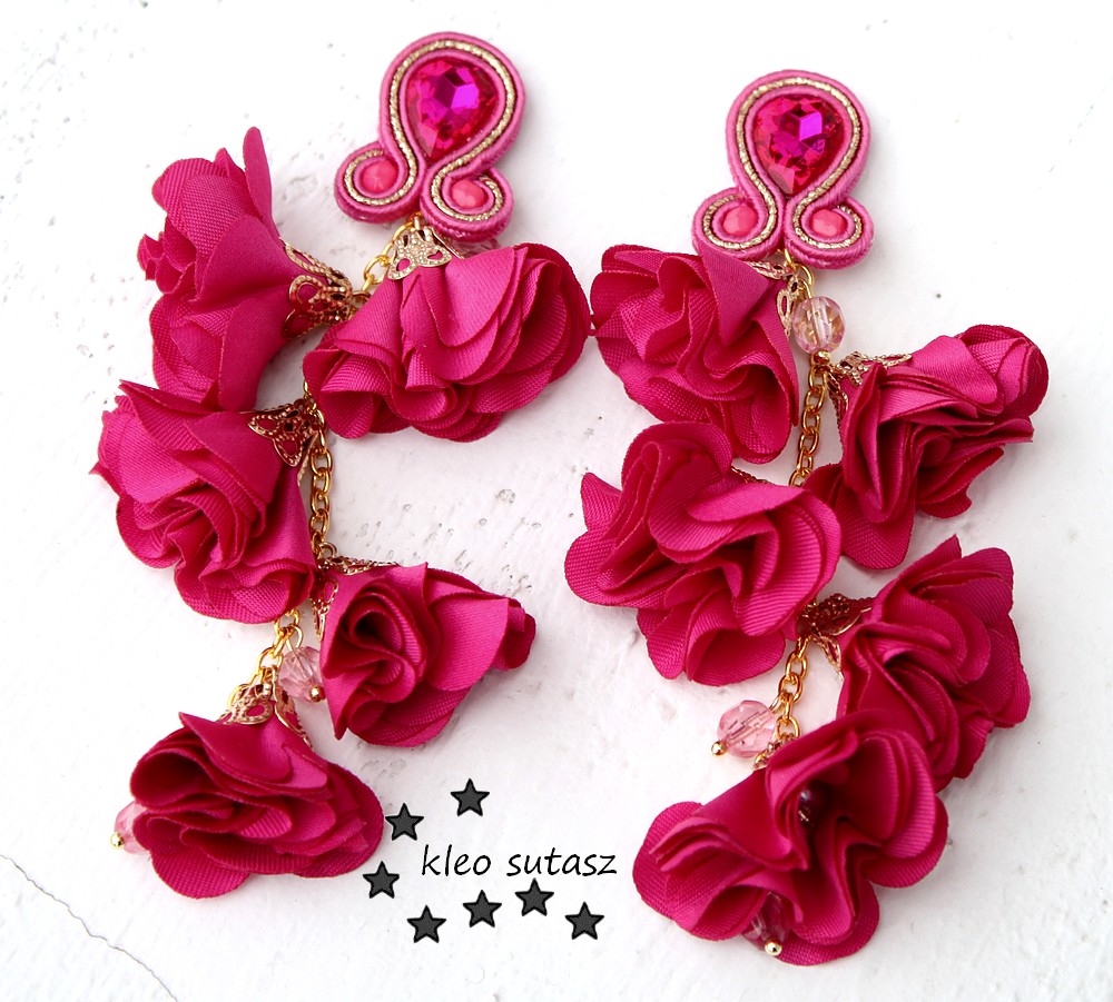 FLORE FUKSJA- FUKSJOWE, RÓŻOWE, DŁUGIE KOLCZYKI SUTASZ Z KWIATKAMI ZŁOTE