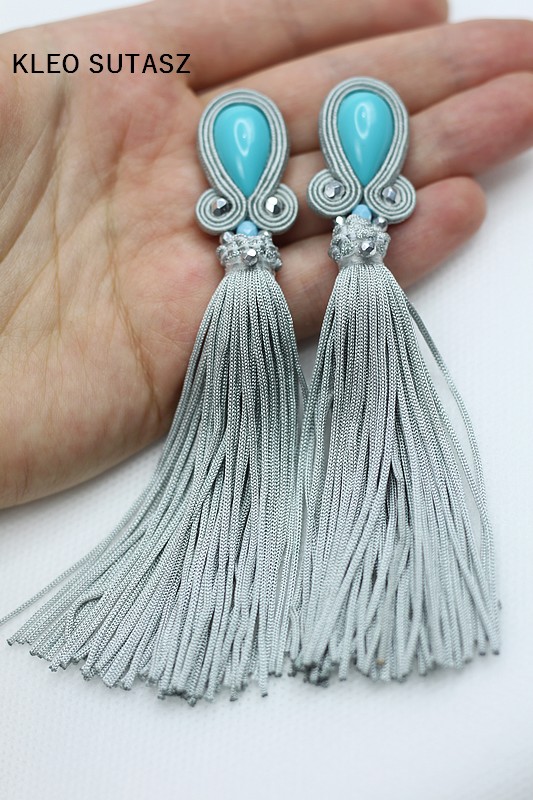 KOLCZYKI CHWOSTY SZARE TURKUSOWE SUTASZ Z CHWOSTAMI