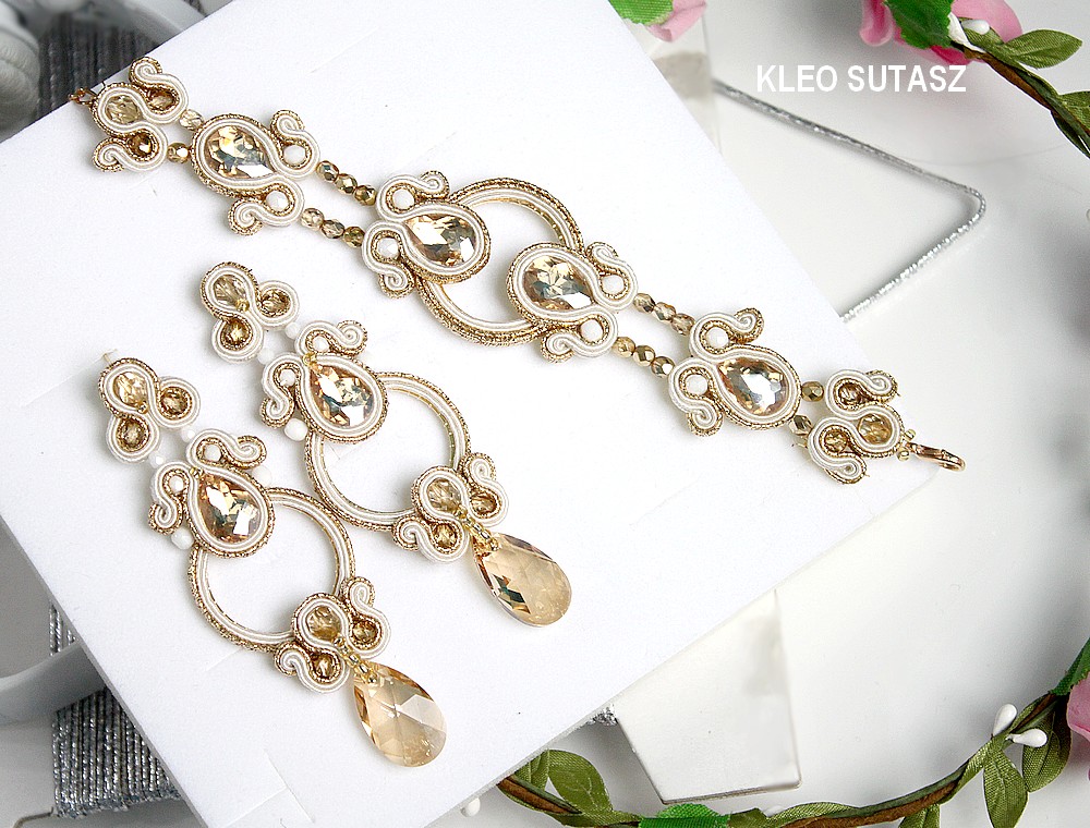 MALALA- KOLCZYKI, KOŁA, ZŁOTE, ECRU, ŚLUBNE 9 CM, SUTASZ