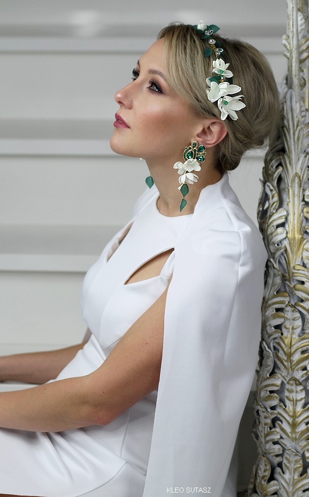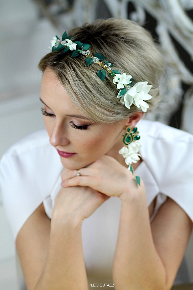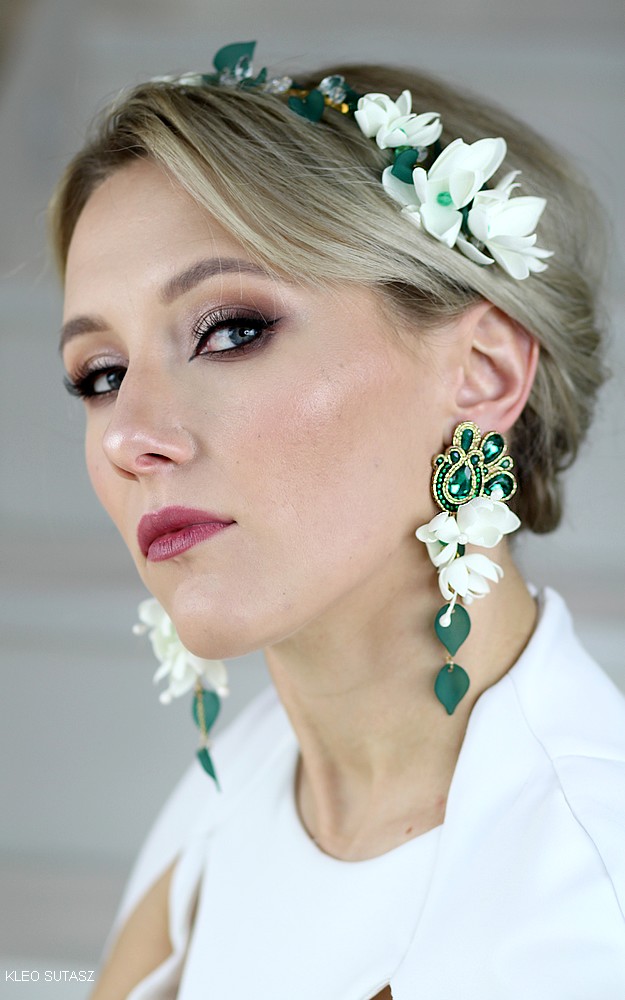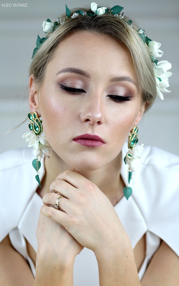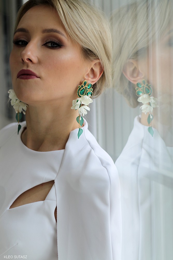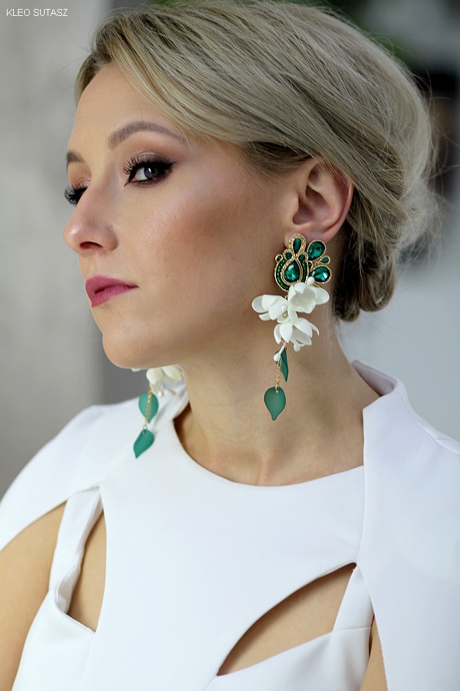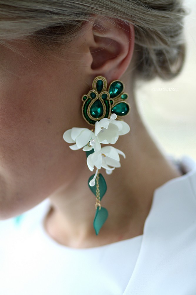 MAYA- JAŚMINOWE KOLCZYKI ŚLUBNE SUTASZ KWIATOWE SZMARAGDOWE ZIELONE ZŁOTE